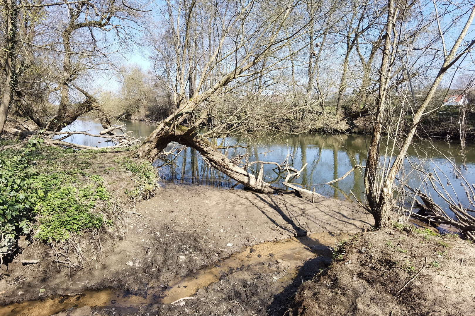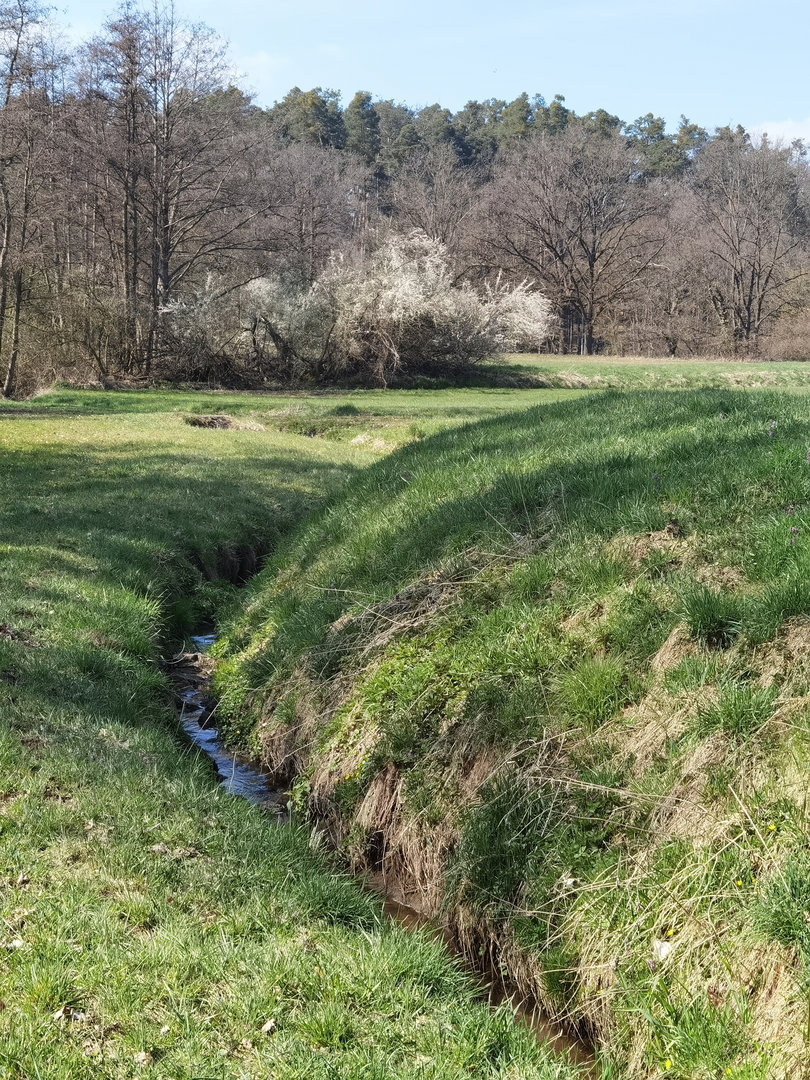 Um wirklich bis zur Mündung des Krottenbach in die Rednitz zu gelangen kann man zunächst einem noch gut erkennbaren Fahrweg der Landwirtschaft folgen, muß dann jedoch die Wiesen durchqueren (Bitte nicht während der Vegetationsperiode von April bis Oktober betreten!) und sich dann durch den verwilderten Auwald kämpfen.