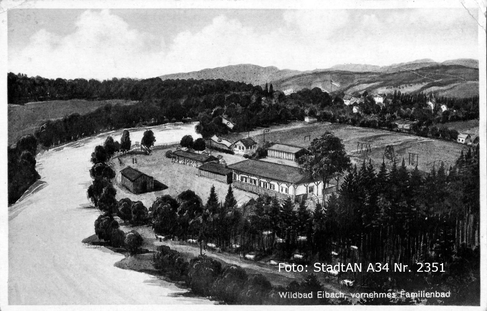 das bei den Eibachern besondere Beliebtheit genoss. Aufgrund seiner Ausstattung mit großen Umkleidekabinen, Spielwiese und sogar einer Wasserrutsche galt es als „vornehmes Familienbad“. Aufgrund einer Stelle im Fluß mit Strömung und Tiefe galt es aber auch als gefährlich und wie eine Legende berichtete, soll dort ein Pfarrer ertrunken sein, wovon dieses den Namen „Pfarrersdümpfel“ davontrug. (Abb.: Luftansicht + Badeleben).