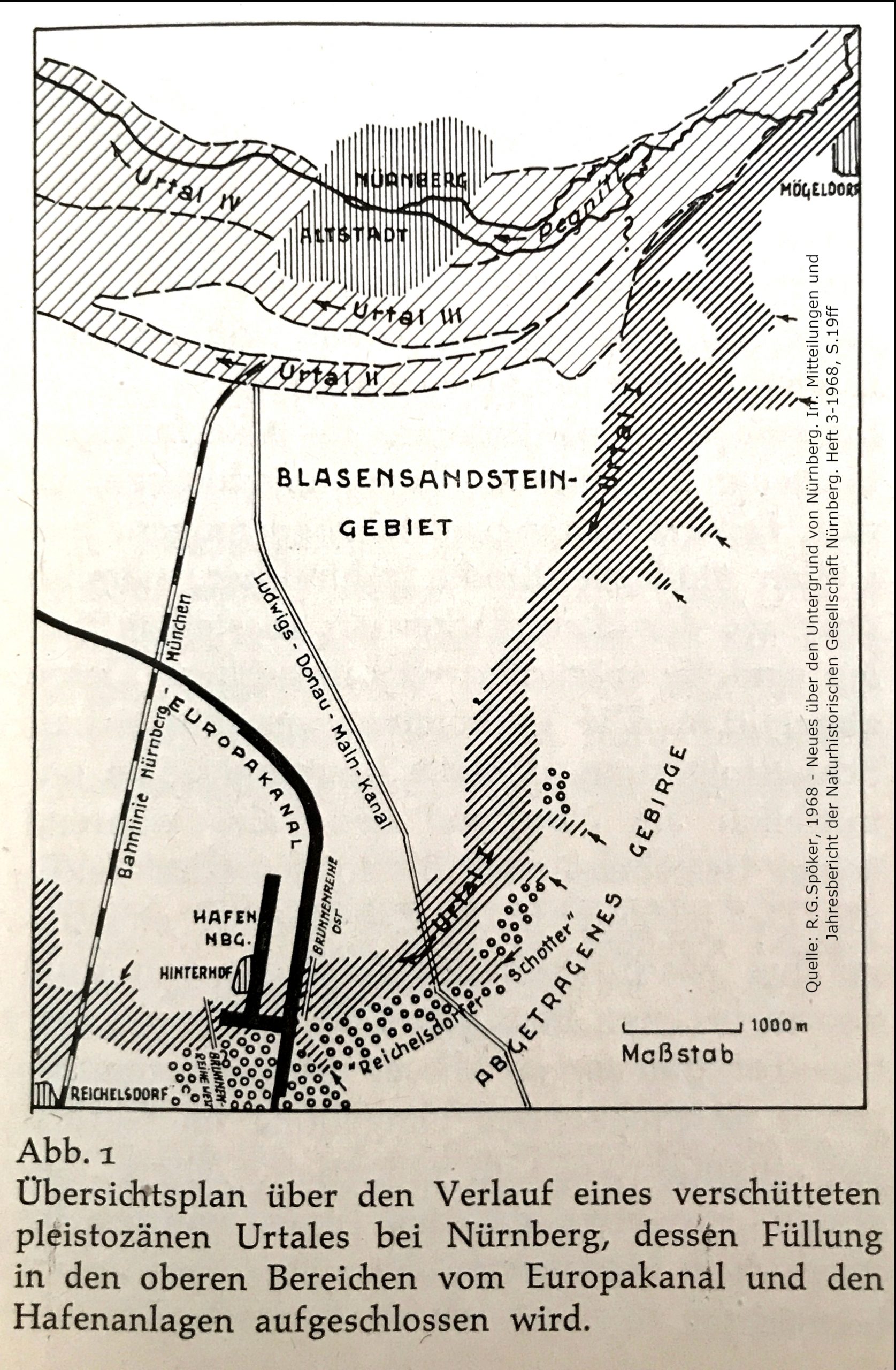 Mit der Planung des Bayernhafens Nürnberg-Roth und des Rhein-Main-Donau-Kanals wurde erstmals die Geologie des Urstromtals in diesem Bereich sichtbar. Die geologische Karte (Abb.1) stammt aus der entsprechenden Studie zum Hafen und zeigt den Verlauf von Teilen des Urstromtals, der sich v.a. in den hohen Anhäufungen von Sanden wie z.B. in dem hier anschließenden Sandmagerrasen und auch den metertiefen Sandböden des Rednitztals manifestieren.