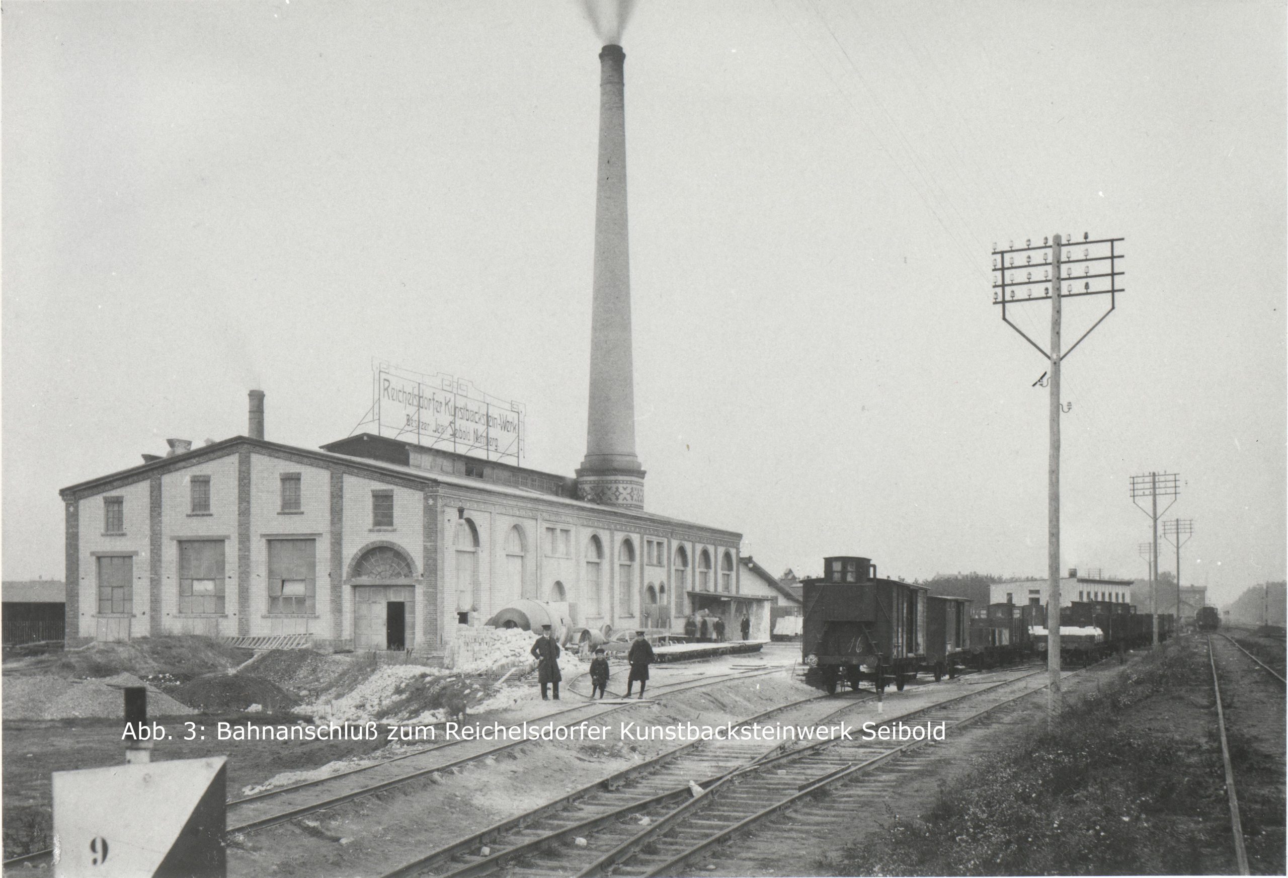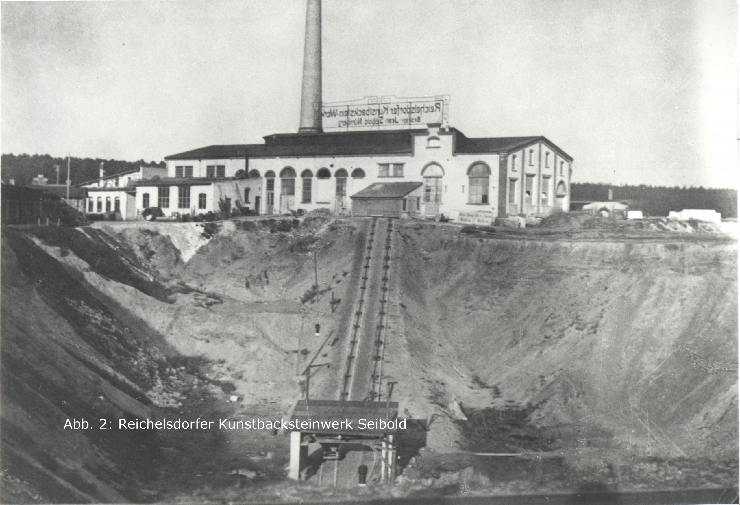 Ein deutliches und markantes Relikt der Urstrom-Tätigkeit ist die als „Sandachse Franken“ bezeichnete langgezogene Struktur von dünenartigen Sandablagerungen, die von Bamberg bis nach Roth zu finden sind. An der Stelle, an der diese Tafel sich befindet, kann man in Richtung zur Rednitz die typische Vegetationsform auf solchen Sandablagerungen finden (siehe dazugehörige Tafel „Perle Sandmagerrasen“ ca. 70 Meter westlich von hier). Wenden Sie jedoch ihren Blick nach rechts über die Schalkhauserstrasse hinüber zum anschließenden Wald, so verbirgt sich dahinter eine weitere dicke Ablagerung von Sanden, die ab ca. 1907 durch die Firma Seibold ausgebeutet und im Reichelsdorfer Kunstbacksteinwerk zu einem wichtigen Baumaterial (v.a. während der Wiederaufbauphase nach dem Zweiten Weltkrieg) verarbeitet wurden (Abb. 2 & 3). Nicht nur bewirkte der Sandabbau (bis in die 1960er Jahre) eine signifikante Landschaftsgestaltung (siehe heutiges Sportgeländes des SV Reichelsdorf), auch bekam das Werk einen Bahnanschluss (Abb. 3), der die Ansiedlung weiterer Industrien förderte.