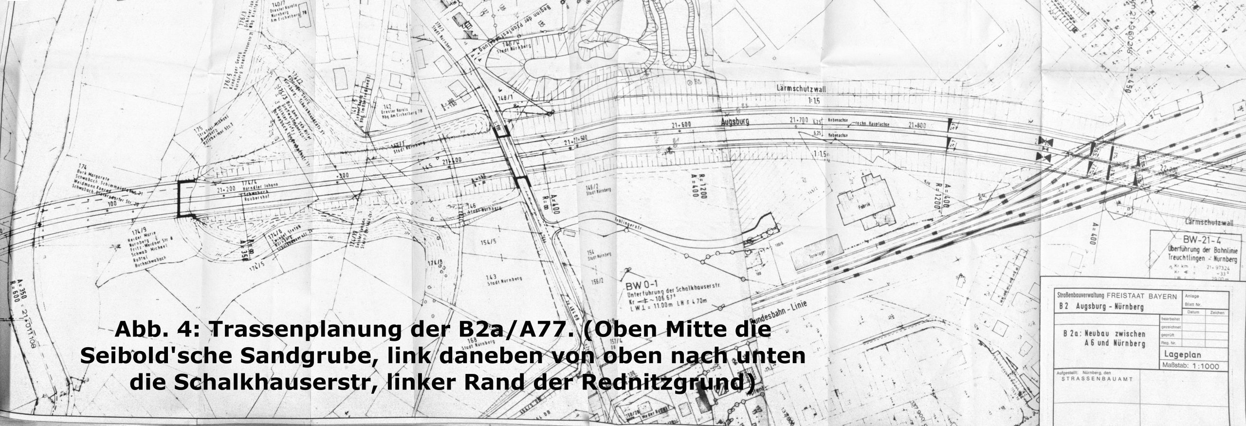 In den 1970er Jahren wird die Verkehrserschließung der Metropolregion vorangetrieben. Hierbei sieht die sog. N4-Entwicklungsachse die Verlängerung und den Ausbau des Frankenschnellwegs über die Hafenstrasse hinaus als B2a/A77 über den Wiesengrund des Rednitztals bis zur Autobahnanbindung bei Schwabach vor. Im Rahmen dieses Ausbaus wäre diese Strasse über eine Brücke über die Bahnlinie hinweg über das Gelände des Gewerbegebiets Reichelsdorf bis in den Wiesengrund geführt worden (Abb. 4). Massive landschaftsverändernde Baumaßnahmen hätten erhebliche Einschnitte in die lokalen Strukturen bewirkt. Der Sportverein Reichelsdorf, der damals zwischen Bahnlinie und Vorjurastrasse lag, konnte erfreulicherweise auf die zwischenzeitlich stillgelegte Seibolt’sche Sandgrube verlegt werden. Auch die damals legendäre Privatmannschaft „Sandhoppers“ (Abb. 5) verlor ihr Trainingsgelände auf der „Rehlerswiese“ südlich des heutigen Hafenkreisels.