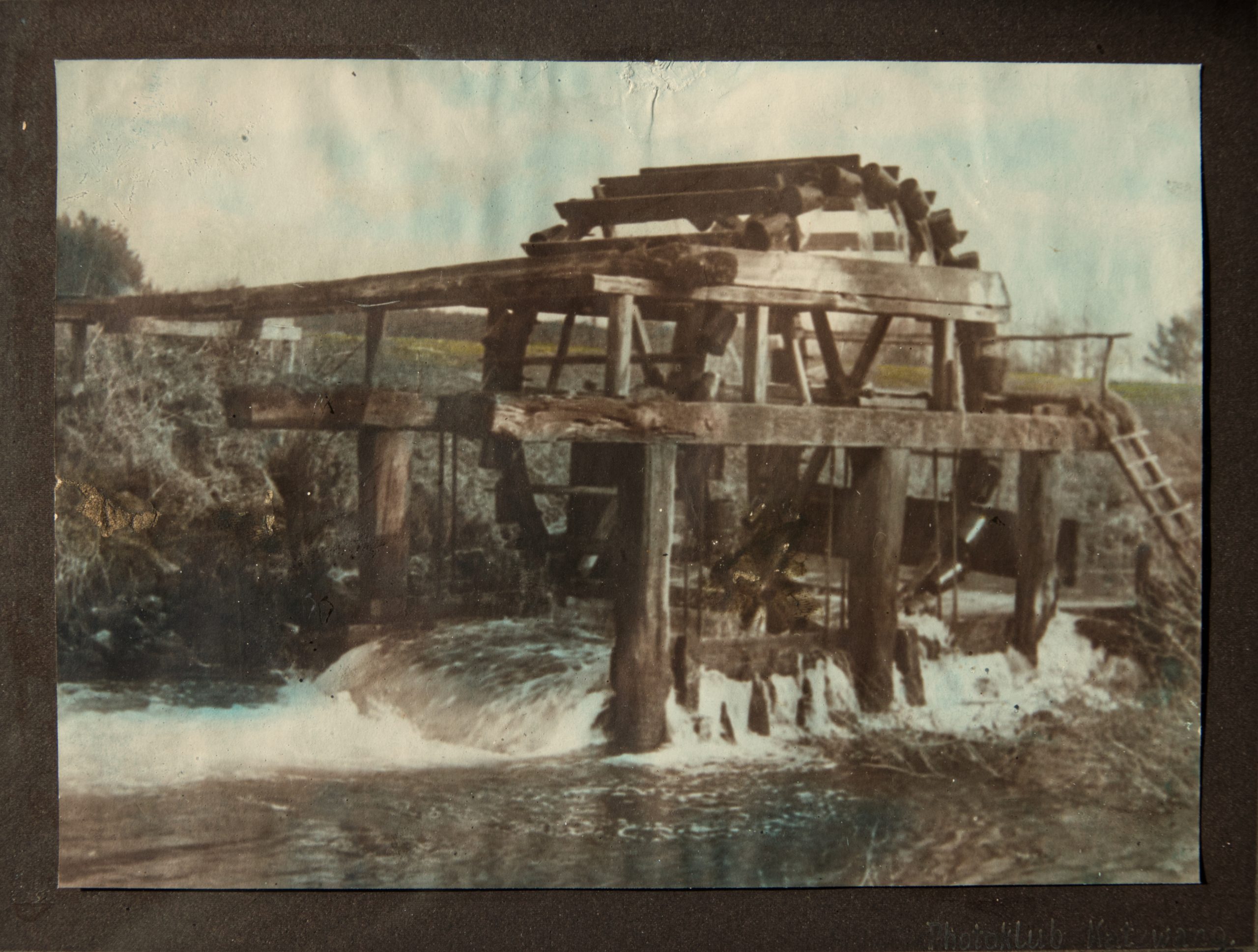 Da die Rednitz an ihrem Oberlauf ihr Bett nur wenig in das Urstromtal eingegraben hat, konnte in weiten Teilen das Abzwei­gen von Be­wäs­se­r­ungs­wasser noch über Wehre und Schwer­kraft­berie­selung er­fol­gen. Je wei­ter die Red­nitz je­doch nach Nor­den kommt, desto tiefer liegt das Flussbett im Vergleich zu den Wiesen und eine einfache Ableitung ist damit nicht mehr möglich. Hier „in der Büg“, wie auch die damalige Wässer­ge­meinschaft hieß, wurde da­her zu­nächst ein Was­ser­schöpfrad in­stalliert, wel­ches das Flusswasser über 2 Meter auf Wie­sen­höhe heben musste. Dieses aus Holz gebaute Wasserschöpfrad (s.Abb.2) wurde 1932 erneut bau­fällig und so stand die Entscheidung an, entweder für teu­res Geld ein neues bauen zu lassen, oder zur inzwi­schen verfügbaren elektrischen Pumpentechnologie zu wech­seln.