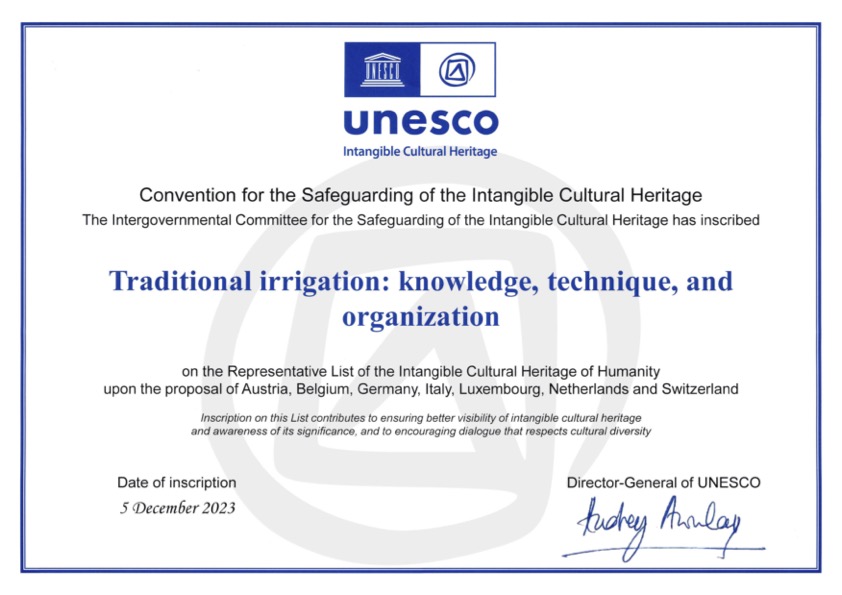 Die traditionelle Bewässerung basiert auf einem umfassenden Verständnis der Landschaft, des Wasserflusses und der Wetterbedingungen. Dieses Wissen wird von Generation zu Generation weitergegeben und wird von Wässergemeinschaften nach traditionellen Regeln und Techniken über Grabensysteme und Wehre durchgeführt. Dabei spielten früher in manchen Bereichen auch saisonal betriebene Wasserschöpfräder, die von der Strömung angetrieben werden, ebenso eine wichtige Rolle. Im Gegensatz zu Baudenkmälern ist immaterielles Kulturerbe lebendig – es prägt unsere Identität und lebt vom sozialen Zusammenhalt.